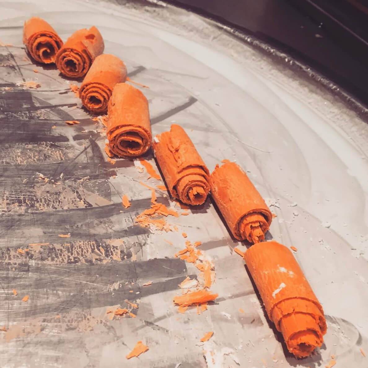 Metal paddles are then used to quickly chop up all the ingredients and mash them together, to be spread into a thin layer. Within a couple of minutes, the ice cream firms up with the ingredients mixed in, and it’s then scraped up into rolls and served in cups.