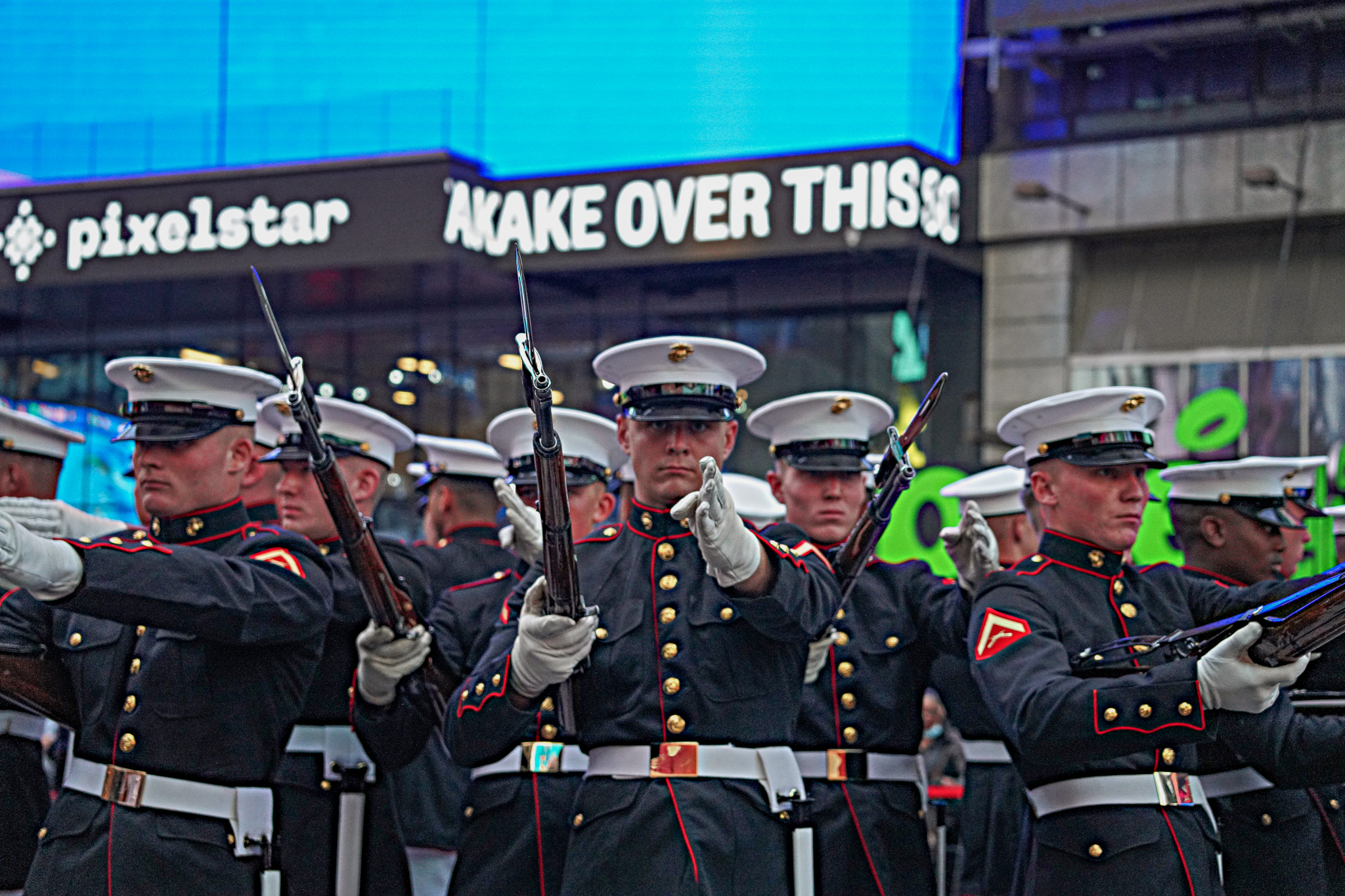 Hundreds of tourists and New Yorkers alike gathered in Father Duffy Square to watch members of the Armed Forces assemble in formation, play music and demonstrate their skills through a unique display of military training that saw the Marines twirling their firearms in midair. Kicking off Fleet Week, the presentation had many looking on in awe, including youngsters who are currently being mentored by a police program.