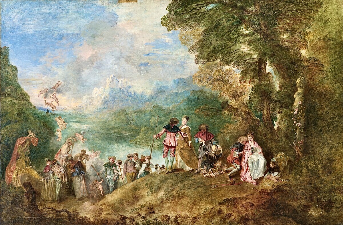 In 1963, Tanning and her Dogs of Cythera arrive as correction. Cythera — the Rococo dream of effortless pleasure — enters Western art history most famously through Jean-Antoine Watteau’s “Pilgrimage to Cythera,” an image of lovers drifting through a pastoral theater of sanctioned desire, where femininity functioned as ornament and leisure masked authorship. That vision—so foundational it appears on the cover of the publication you are now holding—cemented Cythera as a site of elegance without consequence.