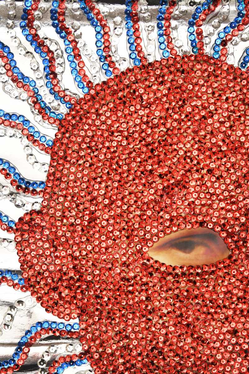 Dams then painstakingly glues the sequins on top of that image, obscuring all but the eyes and creating intriguing new depictions that can be shiny and dark at the same time.
