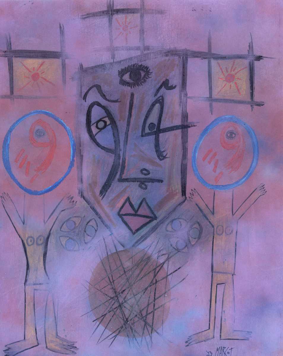 Faces in his work resemble masks pulled from ceremony rather than portraiture drawn from observation. Marks appear closer to glyphs than gestures, as though language itself were attempting to return to a pre-verbal state. Geometry enters not as design, but as containment, an effort to hold something volatile without neutralizing it.