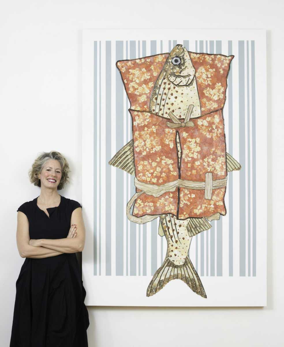 Pressed flowers and paint intermingle on the canvas to form a collage of colors and textures, resulting in a fish wearing a life preserver.