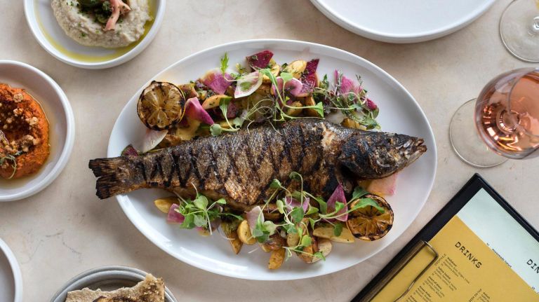 Celestine at 1 John St. This Eastern Mediterranean restaurant is on the DUMBO waterfront, offering views of the Manhattan Bridge, the city skyline, and an inventive menu by executive chef Garett McMahan. Start with the hummus and pistachio feta spread with pita bread, and we suggest going with the generously portioned chermoula branzino (with gold nugget potatoes and radishes), the chicken or grilled asparagus. Make sure to get a reservation so you don’t miss out on the sunset from a tableful of goodness.” data-id=”135023312″ data-link=”https://www.amny.com/wp-content/uploads/2019/10/6016_image.jpg” class=”wp-image-1.35023312″/>Photo Credit: Liz Clayman -