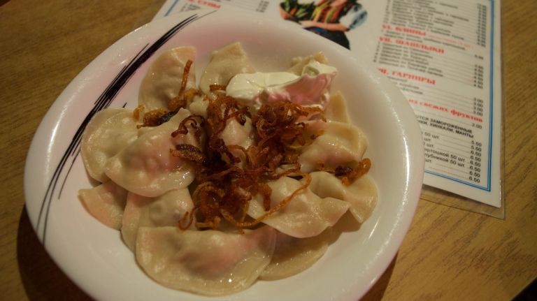 You don’t have to throw a nested doll very far to find Russian or Ukrainian dumplings in Brighton Beach, but extremely affordable prices and charming rustic décor drew us to this cozy establishment off the main avenue, which specializes in what its menu calls “Russian-style ravioli.” Pelmeni are boiled, bite-sized dumplings with thin skins folded like fancy dinner napkins and meat fillings: chicken, veal and “Siberian Meat,” a combination of pork and beef. Their Ukrainian cousins, varenikis, are half-moon in shape, and come stuffed with savory ingredients (creamy potatoes, fried cabbage) and sweet ones (cherries, cottage cheese). A plate of roughly 15 mushroom-and-potato vareniki topped with fried onions and served with a dollop of sour cream cost us $6.95. We recommend drizzling some of the unidentified red sauce on your table — the recipe is a “secret,” our Russian-speaking waitress told a translator, but it obviously includes tomato, garlic and sugar and likely red wine vinegar — on top.