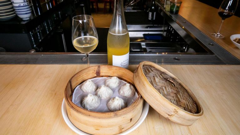 Pork soup dumplings with Wild Arc Farm Piquette (Hudson Valley, New York)