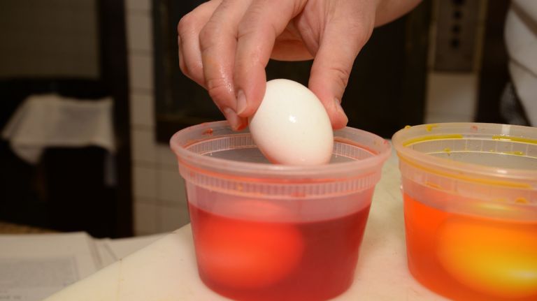 Each hard-boiled egg should sit in a food-coloring mixture (food coloring, water, a touch of white vinegar) for about 15 minutes.