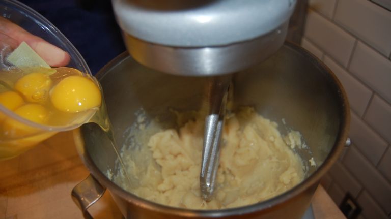 Slowly begin adding the eggs, about 50 grams/3 tablespoons at a time, beating until each addition is completely absorbed before adding the next one. Continue adding the eggs, reserving 25 grams / 1 ½ tablespoons, until the dough comes away from the sides of the bowl when pulled with the paddle but then grabs back on again.