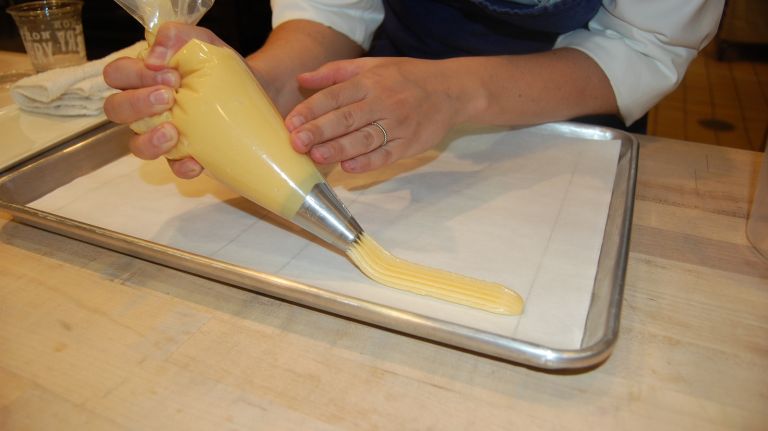 Starting at the side of the Silpat (or parchment) farthest from you, hold the tip of the pastry bag 1 inch above the pan and apply gentle, steady pressure as you pipe the first éclair following the template lines.