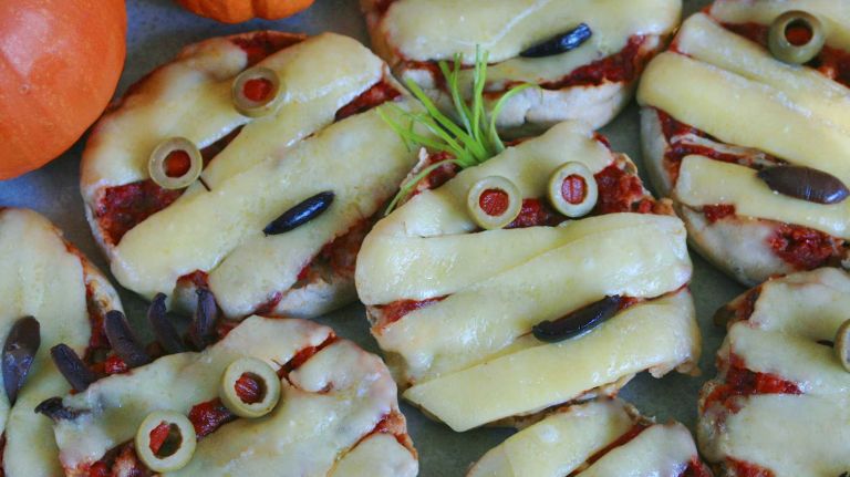 2. Spread thin layer of marinara on cut side of English muffins. Place cheese in zigzag pattern on top of marinara for “bandages.” Place green olives, cut side facing up, on each pizza for eyes and a strip of black olive for mouth. Add garnishes such as scallions, celery and peas, to dress up faces as desired.