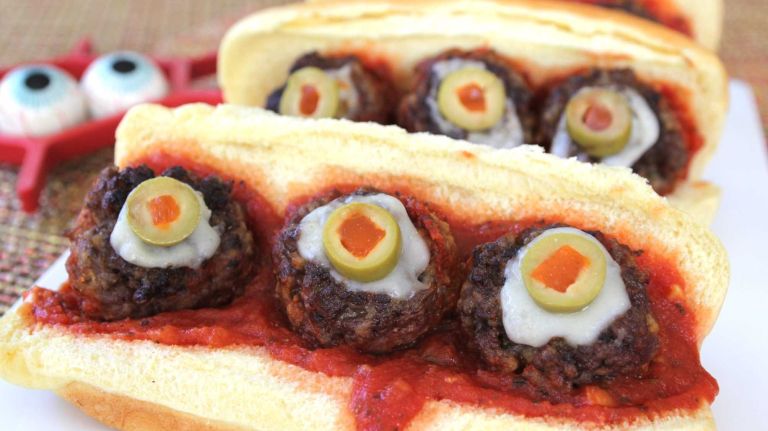 5. Warm the tomato sauce in the skillet; place the meatballs “eyeballs” facing up in the sauce until warmed through. To serve, spoon the sauce in the folds of each roll and top with the meatballs. Makes 6 servings.” data-id=”16302247″ data-link=”https://www.amny.com/wp-content/uploads/2019/10/10902_image.jpg” class=”wp-image-1.6302247″/>
