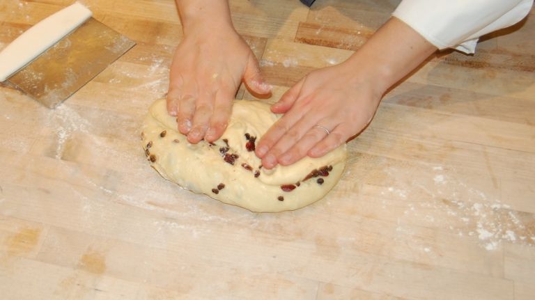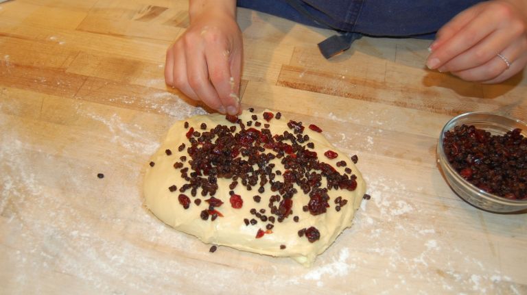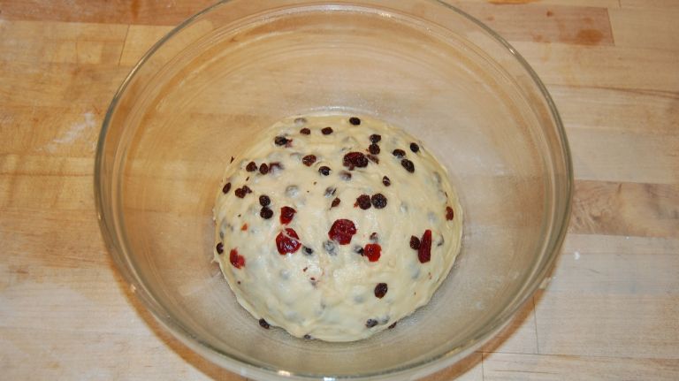 With your hands, gently pat the dough into a circular shape. Pour some of the currant-cranberry mixture onto the dough and knead it into the dough (which will be sticky) to distribute it evenly.