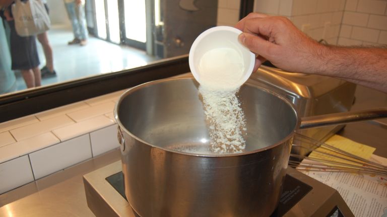A note on equipment: At Ample Hills, they do not make batches that are as small as this recipe. Some of the appropriately sized bowls and saucepans were not available. Please note the sizes of receptacles in the recipe. Also, any at-home ice cream maker will do.