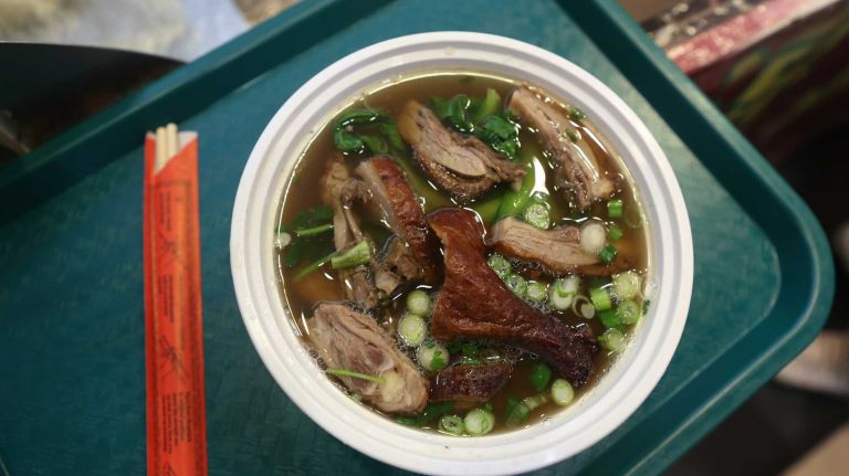 Pictured: The roast duck ramen at Li Lanzhou in the New World Mall food court in Flushing, Queens on Friday, May 8, 2015.” data-id=”110422385″ data-link=”https://www.amny.com/wp-content/uploads/2015/05/image-168.jpg” class=”wp-image-1.10422385″/>Photo Credit: Linda Rosier -