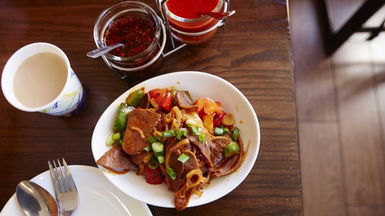 Top choices at Phayul in Jackson Heights, Queens include thin slices of stir-fried beef tongue with bell peppers and onions (pictured), which are fiery and smoky; beef soup is a soothing, milky-looking broth with sweet daikon radish, chewy, rich meat and Tibetan mountain herbs. Info: 718-424-1869.” data-id=”110422410″ data-link=”https://www.amny.com/wp-content/uploads/2015/05/image-170.jpg” class=”wp-image-1.10422410″/>Photo Credit: Yvonne Albinowski -