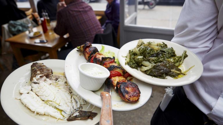 Pictured: A waiter carries over to a table orders of a Greek salad and lemon potatoes at Taverna Kyclades in Astoria, Queens on April 11, 2015.” data-id=”110422374″ data-link=”https://www.amny.com/wp-content/uploads/2015/05/image-258.jpg” class=”wp-image-1.10422374″/>Photo Credit: Yvonne Albinowski