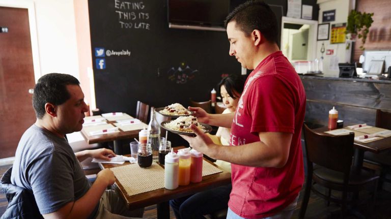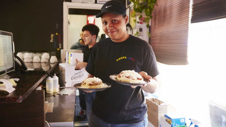 Pictured: Cristian Romero serves arepas Colombian-style to customers at Arepa Lady in Jackson Heights, Queens, April 12, 2015.” data-id=”110422434″ data-link=”https://www.amny.com/wp-content/uploads/2019/10/10038_image.jpg” class=”wp-image-1.10422434″/>Photo Credit: Yvonne Albinowski -