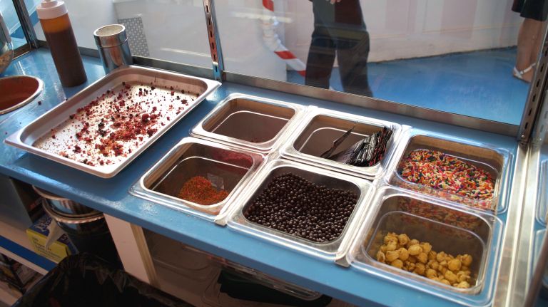 At the toppings bar, your “sideshow” options, as the menu calls them, include rainbow sprinkles, pink chocolate dip, caramel popcorn, salted caramel and chocolate pearls. They’re $1 each.