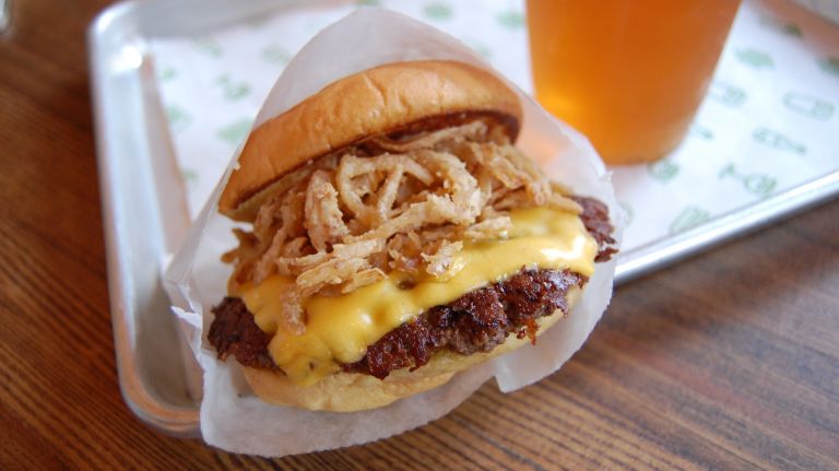 The details:The ShackMeister is a brand new item from Shake Shack, the rapidly expanding and hugely popular New York City-based burger brand. The cheeseburger, which won a recent SOBE Wine and Food Festival Burger Bash, is a cheeseburger topped with ShackSauce (secret recipe, but it’s mayo based and is both sour from pickles and spicy from spices) and crispy ShackMeister Ale-marinated shallots. The ShackMeister Ale is made by the Brooklyn Brewery.