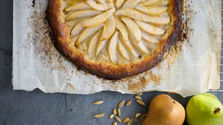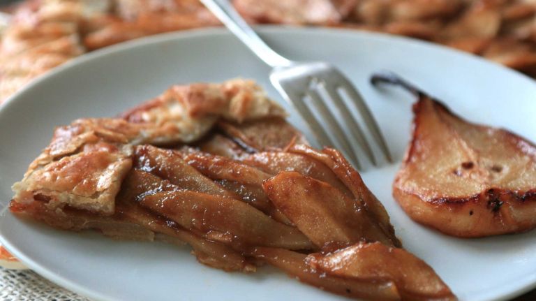 4. Arrange pear slices in concentric circles on top of dough. Brush edge with egg yolk. Bake until crust is golden brown, 35 to 40 minutes. Slide tart, still on parchment, onto a wire rack. Brush pears with jelly or jam and let stand 20 minutes before slicing and serving warm, or cool to room temperature before serving. Makes 6 to 8 servings.” data-id=”19575960″ data-link=”https://www.amny.com/wp-content/uploads/2019/10/10823_image.jpg” class=”wp-image-1.9575960″/>