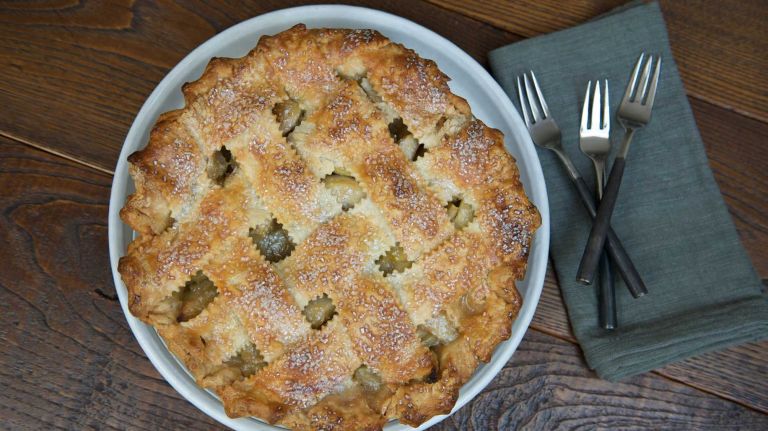 10. Brush the lattice and rim with the beaten egg. Place the pie on the preheated baking sheet and bake for 25 minutes. Lower the heat to 375 degrees and continue to bake until the lattice and rim are golden brown, another 30 to 40 minutes. Cool completely on a wire rack and serve.