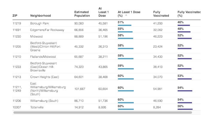 Borough Park, Brooklyn finally passed the halfway point this past week, with a first-dose rate of 51% reported as of Nov. 28. The area still has the lowest percentage of fully vaccinated residents in the city at 46%.