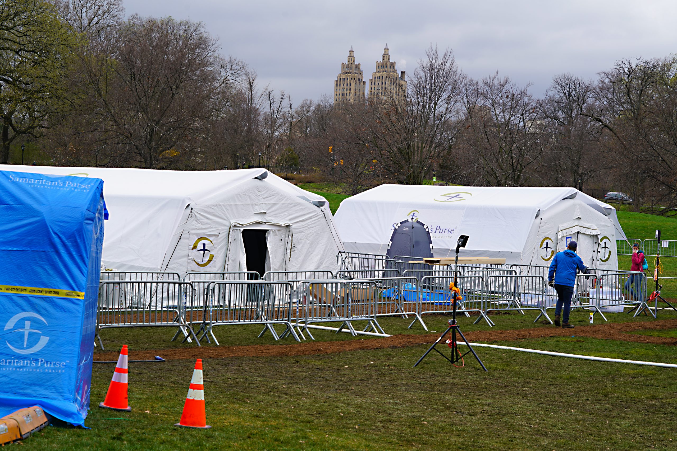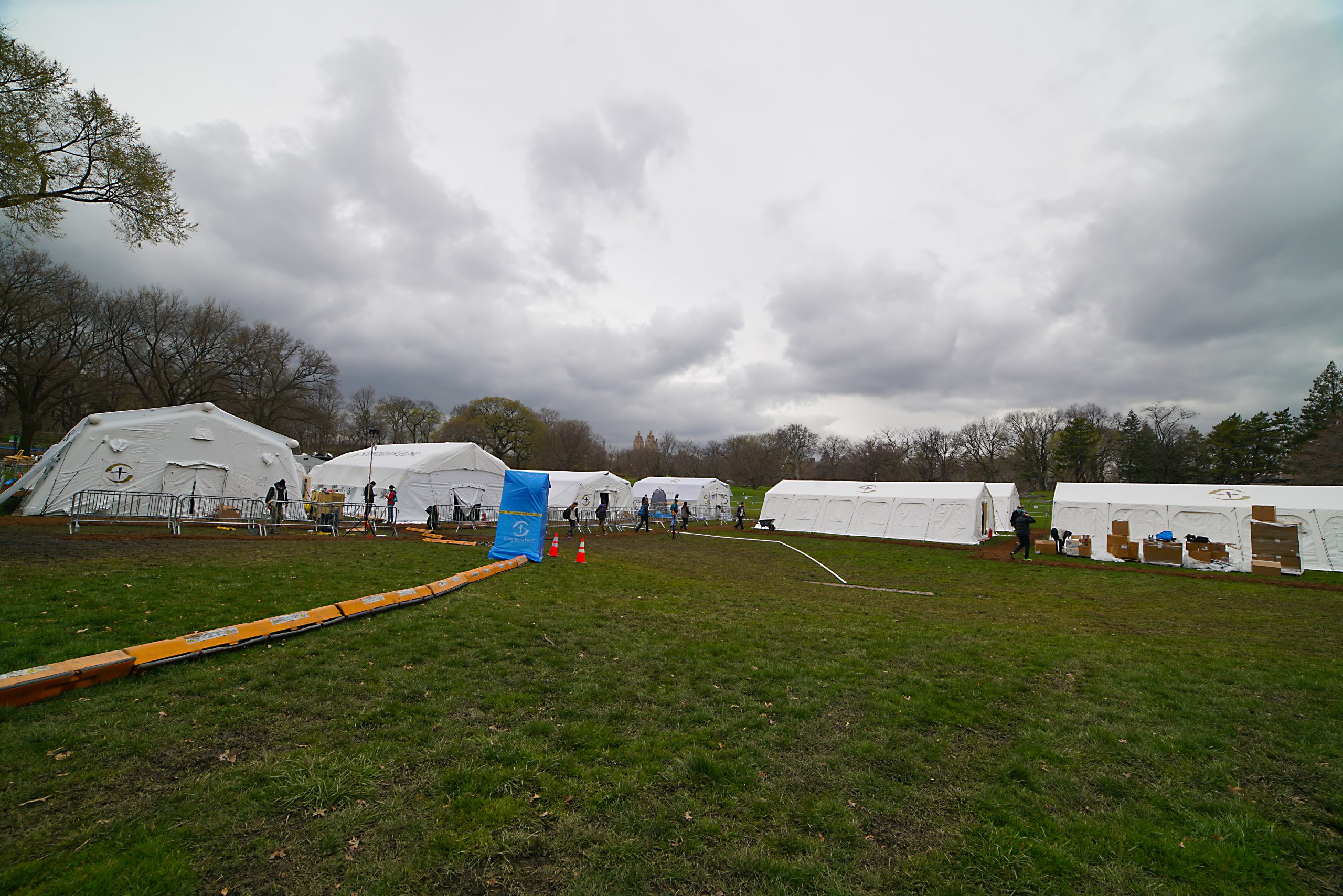 The field emergency hospital is comprised of 14 tents that contain 68 beds, ten of which are intensive care beds. The intensive care unit has 10 ventilators. The hospital will be staffed by doctors, nurses, lab technicians, and other medical personnel from the Mount Sinai system and 86 disaster relief specialists from the humanitarian relief organization Samaritan’s Purse.