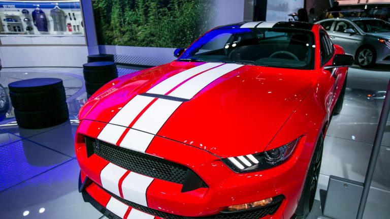The Ford Shelby GT-350 is on display at the 2016 New York Auto Show’s press preview day at the Jacob K. Javits Convention Center in Manhattan on Wednesday, March 23, 2016.