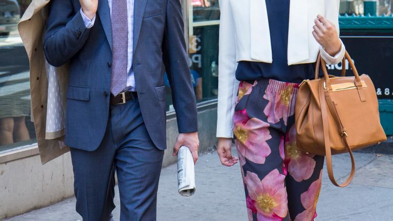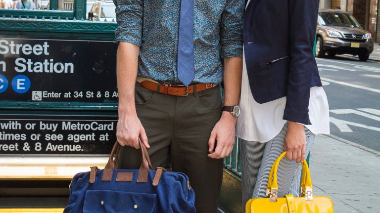 On Ryan: Club Monaco shirt, $89.50; at Club Monaco | Vince Camuto pants, $85, and watch, $295; at Vince Camuto | Ray-Ban leather sunglasses, $300; at Sunglass Hut | The Tie Bar tie, $15; at thetiebar.com | Bills Khakis belt, $65; at Peter Elliot Boots, Etc., 1179 Lexington Ave., 212-776-1925 | Flint and Tinder bag, $159; at flintandtinderusa.com | TOMS shoes, $98; at Shoegasm, 71 Eighth Ave., 212-691-2091. On Sierra: Ann Taylor shirt, $69.50; at Ann Taylor | G-Star blazer, $300; at G-Star | Nanette Lepore pants, $298; at 958 Madison Ave., 212-452-3056 | Carlo Pazolini handbag, $475; at 410 W. 14th St., 212-259-0517 | Vince Camuto heels, $149; at Vince Camuto ” data-id=”18712280″ data-link=”https://www.amny.com/wp-content/uploads/2019/10/18921_image.jpg” class=”wp-image-1.8712280″/>Photo Credit: Barbara Alper