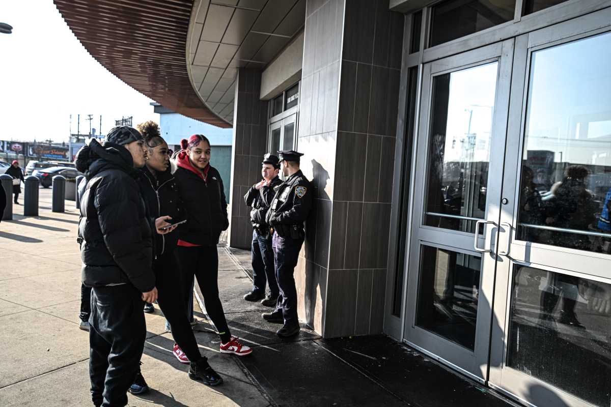 Dozens of cops were stationed at every entrance to the shopping mecca throughout the day on Feb. 17. Security guards stood at the ready, even stopping groups of young people from entering the premises together. Inside, more officers could be seen patrolling the storefronts.