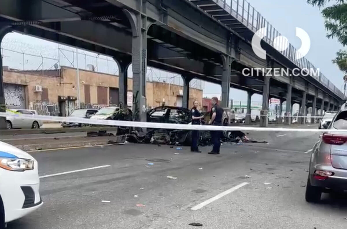 A video posted on Citizen later that day shows the burnt-out wreckage with police cordoning off a one-block stretch of the busy Atlantic Avenue thoroughfare.