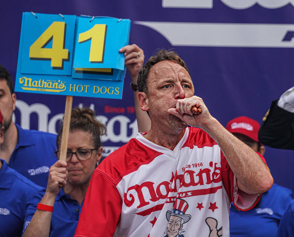 “Aw, man I’m sorry guys. I got the win but nowhere near my record. I started slowing down and it got hard,” Chestnut said. “It’s weird but no good excuses. I didn’t break the record. But I’ll be back next year. I will find a way to do it.”