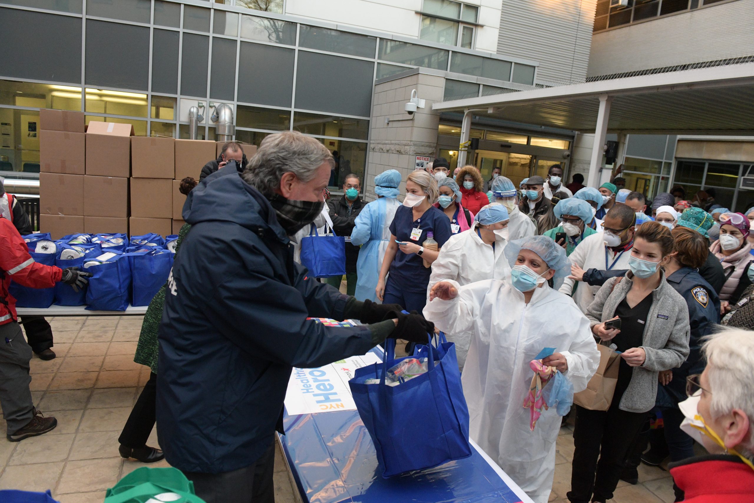 Members of the American Red Cross, the Robin Hood Foundation and representatives of Aramark, a provider of food services and uniforms, joined de Blasio and McCray to distribute 600 donated care packages of food and personal care products to health care workers who lined up in their PPEs to receive the them.
