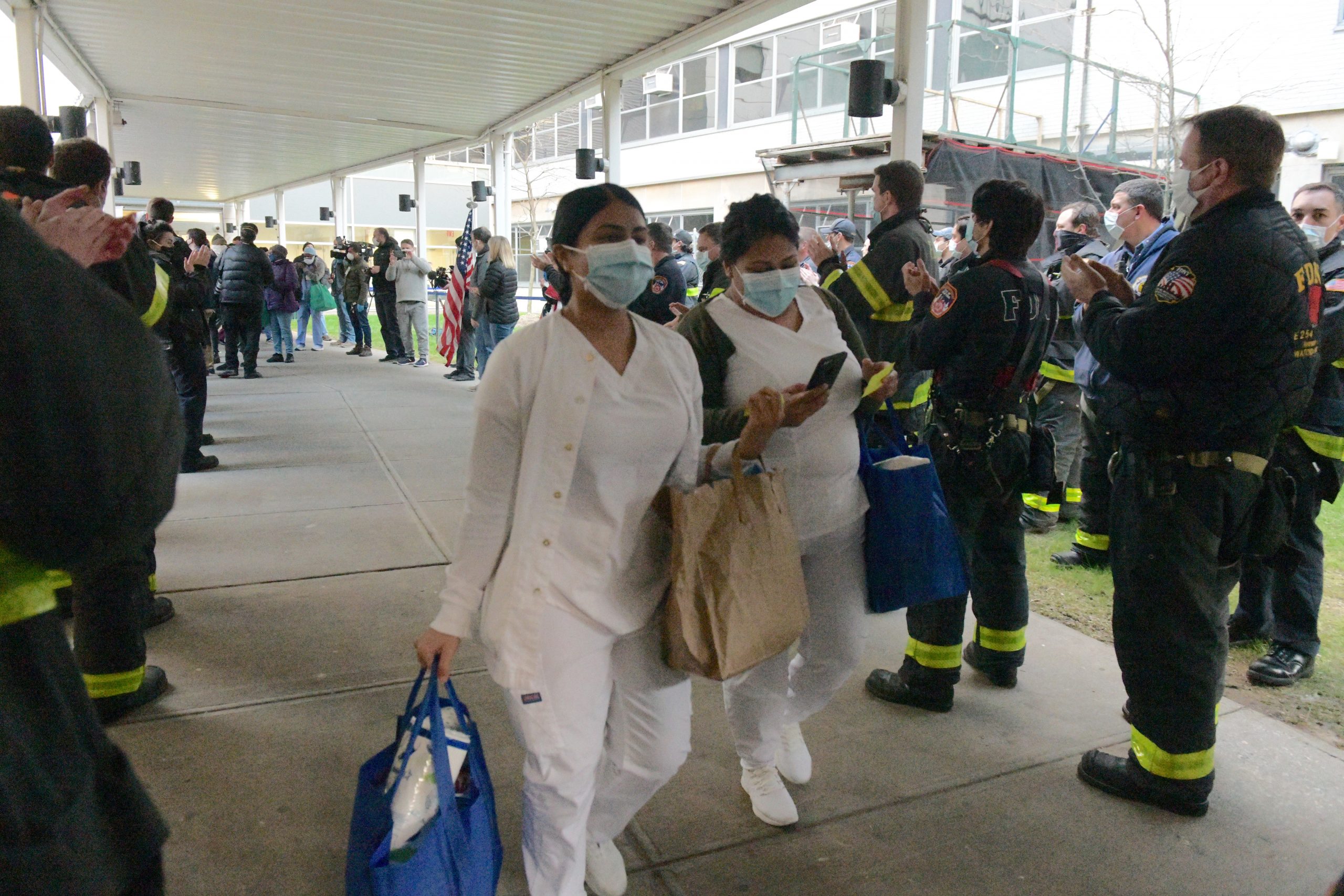 Hospital workers helping Covid-19 patients watch from hospital window. (Photo by Todd Maisel)First responders applaud front line workers at Coney Island Hospital. (Photo by Todd Maisel)Hospital staff take photos. (Photo by Todd Maisel)Mayor Bill de Blasio was joined by wife Chirlane McCray, firefighters, police officers in honoring hospital staff at Coney Island Hospital for their work in the fight against Covid-19, He gave out food and care packages to the health care workers and announced a serious of large donations to the hospital. (Photo by Todd Maisel)Firefighters applaud medical workers. (Photo by Todd Maisel)Mayor Bill de Blasio was joined by wife Chirlane McCray, firefighters, police officers in honoring hospital staff at Coney Island Hospital for their work in the fight against Covid-19, He gave out food and care packages to the health care workers and announced a serious of large donations to the hospital. (Photo by Todd Maisel)He gave out food and care packages to the health care workers and announced a serious of large donations to the hospital. (Photo by Todd Maisel)He gave out food and care packages to the health care workers and announced a serious of large donations to the hospital. (Photo by Todd Maisel)Hospital worker gets selfie with Chirlane McCray after she gave out food and care packages to the health care workers and announced several large donations to the hospital. (Photo by Todd Maisel)Mayor Bill de Blasio was joined by wife Chirlane McCray, firefighters, police officers in honoring hospital staff at Coney Island Hospital for their work in the fight against Covid-19, (Photo by Todd Maisel)Mayor Bill de Blasio was joined by wife Chirlane McCray, firefighters, police officers in honoring hospital staff at Coney Island Hospital for their work in the fight against Covid-19, He gave out food and care packages to the health care workers and announced a series of large donations to the hospital. (Photo by Todd Maisel)Hospital workers leave with care packages as first responders applaud. (Photo by Todd Maisel)First responders applaud medical workers. (Photo by Todd Maisel)Medical workers are applauded by first responders. (Photo by Todd Maisel)