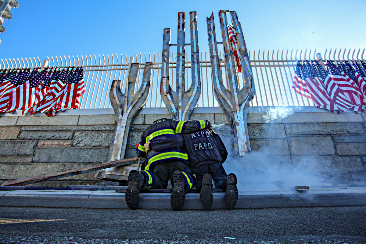 Before the firefighters assembled on the starting line, the first responders formed up for the unveiling of a sculpture by Staten Island artist Scott LoBaido. Depicting an NYPD officer and a firefighter clutching one another, the pair knelt at the remnants of the collapsed Twin Towers of the World Trade Center as smoke bellowed around them.