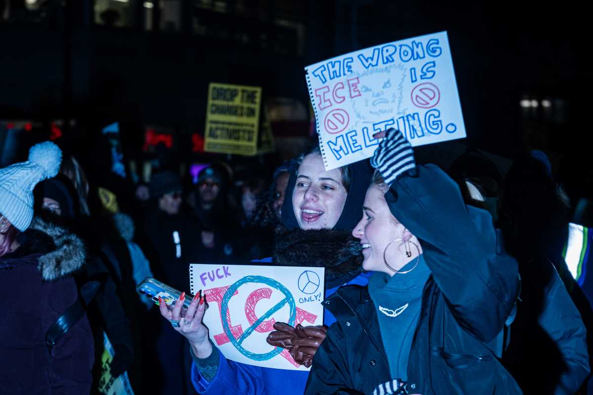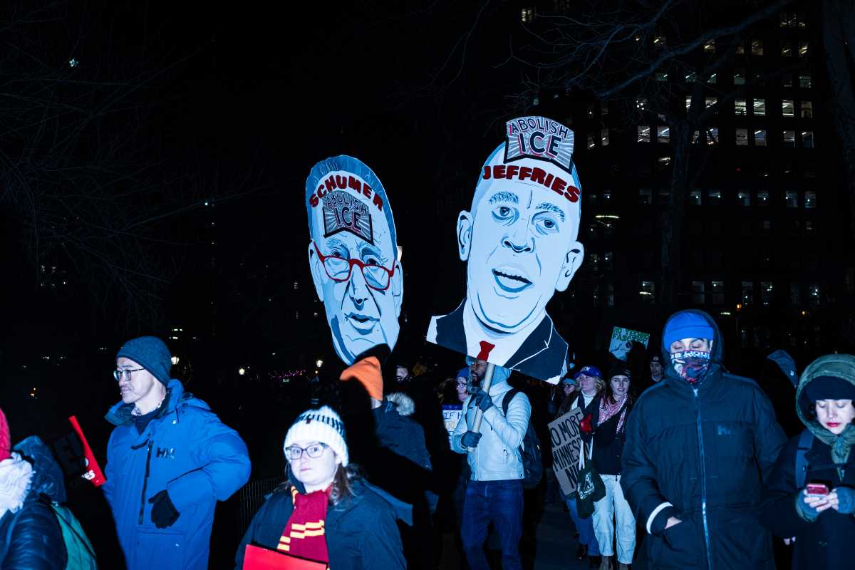 Protestors on Friday night carried signs in the shape of whistles with the words “Hands Off NYC” and “NO ICE” and banners that read “ICE out for good” and “Stop disappearing our neighbors.” Others brought hand-painted signs depicting victims of ICE enforcement and some signs for the elected officials whom the protestors are demanding action from.