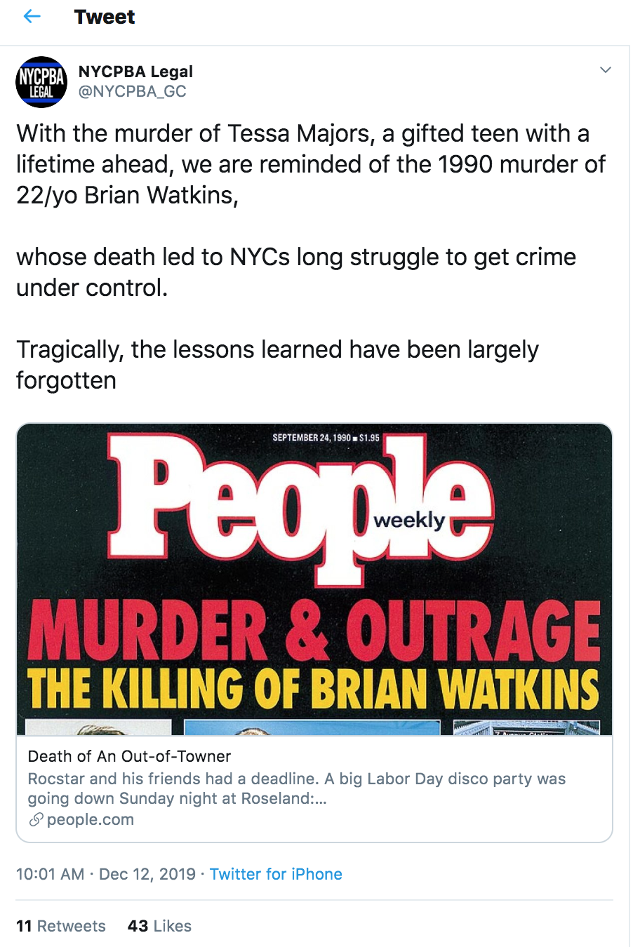 Even the General Counsel’s Office of the Police Benevolent Association made reference in a tweet Thursday to a high profile murder which ended in the wrongful conviction of a Queens man.