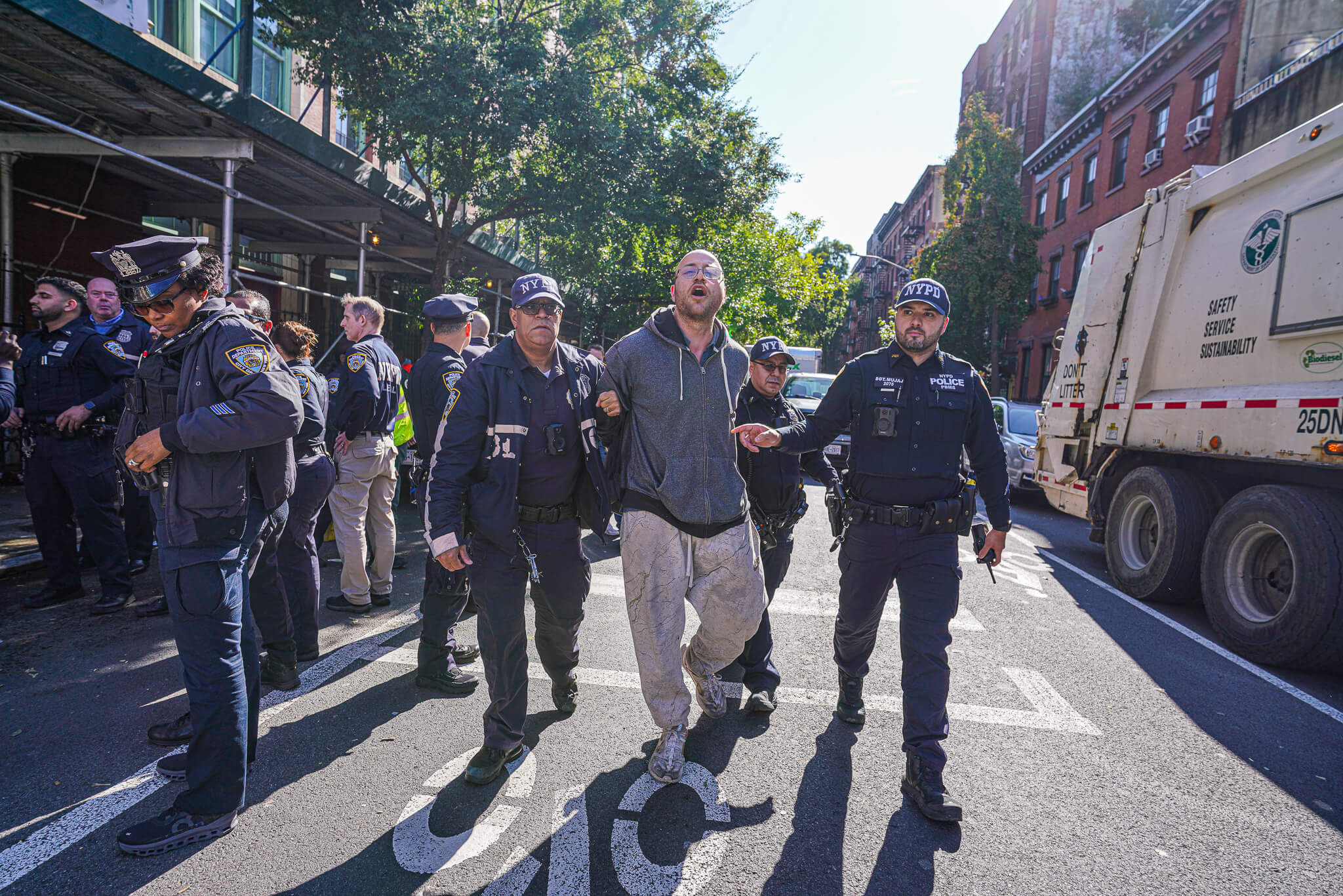 An East Village homeless encampment sweep descended into chaos Wednesday, as a massive police presence dismantled the sidewalk lodging, resulting in one arrest.