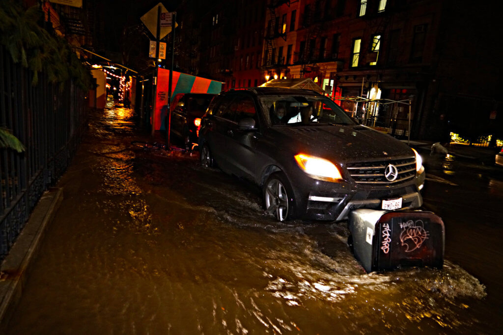NYPD officers parked their vehicle on Avenue A side of East 7th Street but those in the area were largely left to fend for themselves while the Fire Department inspected the vicinity for the cause of the flood and electrical dangers.