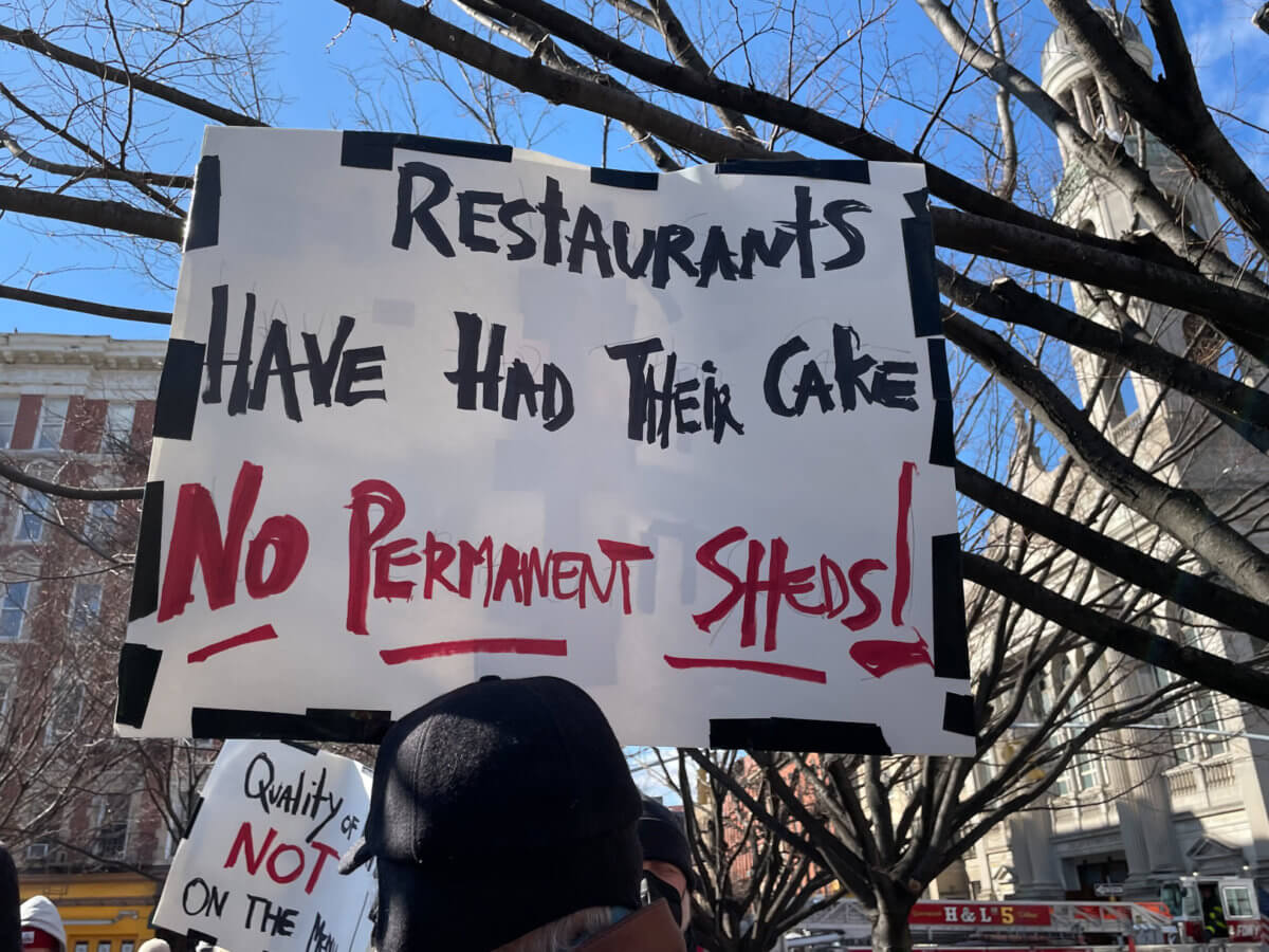 “I am disheartened by what it looks like now,” said State Representative Debra Glick to those assembled at the Arch. “Yes!” was shouted from the crowd. Glick continued, “All of us supported the emergency measures to save our restaurants! And we’re not past COVID so we still need to support those restaurants. But it cannot be a permanent fixture.”