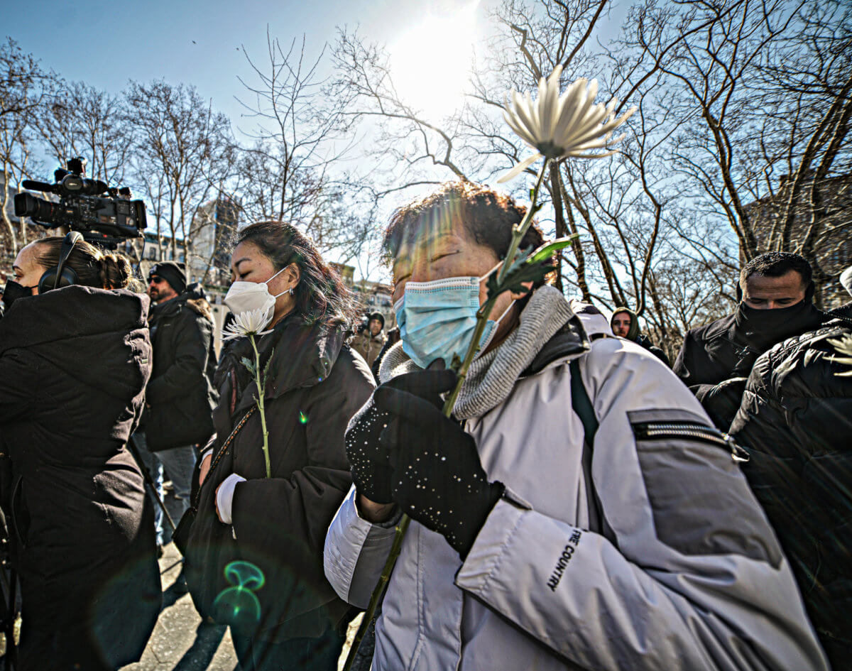 Following the vigil, community members lifted flowers above their heads and marched to Lee’s apartment, chanting, “Christina, with you” in unison as they, one by one, placed flowers outside her apartment building.