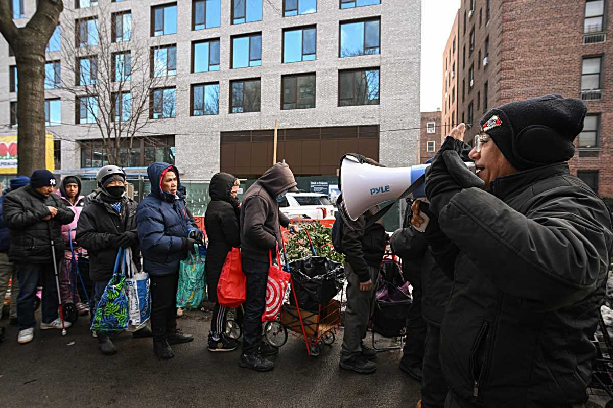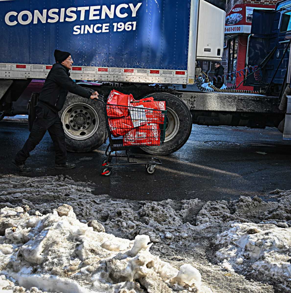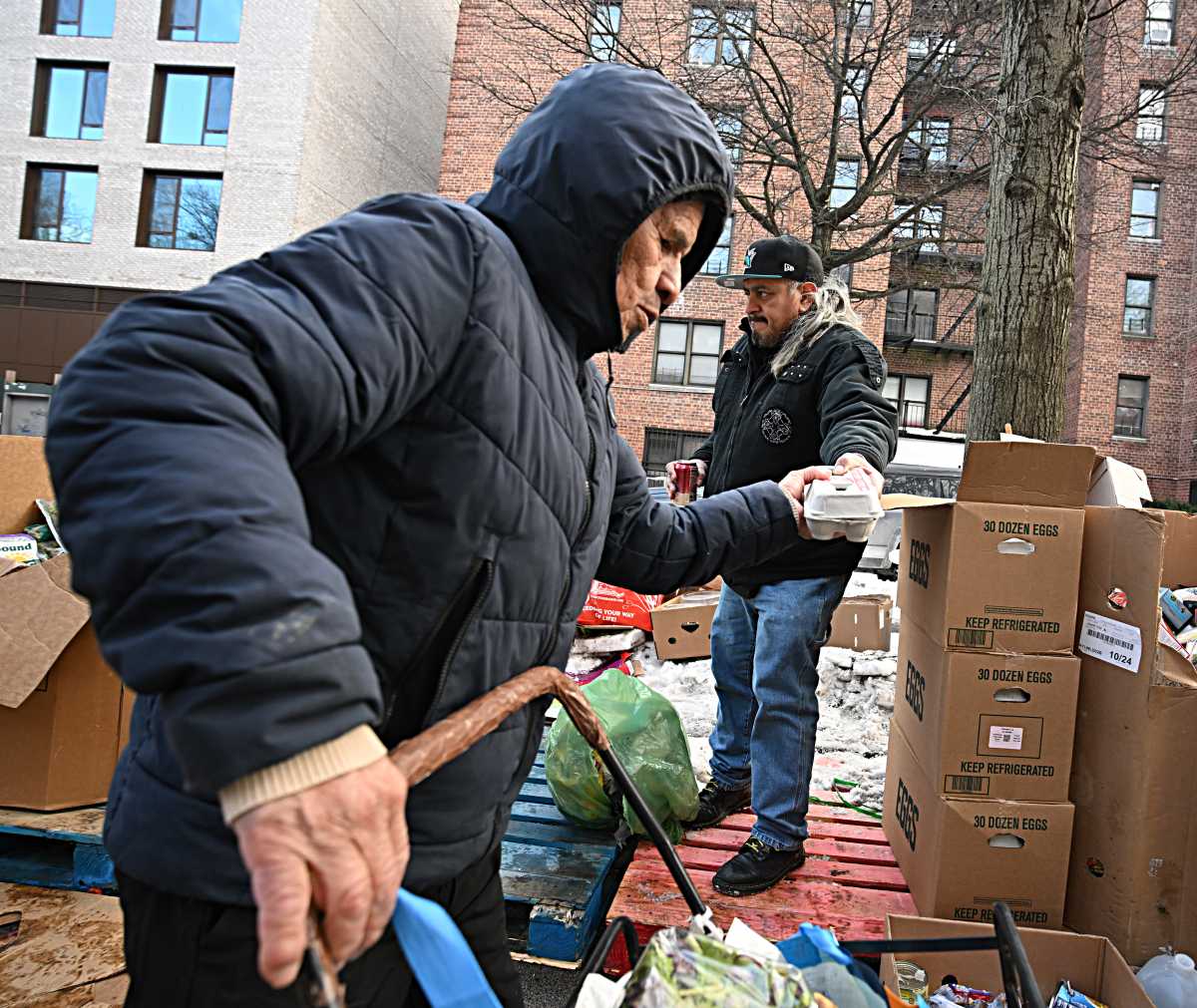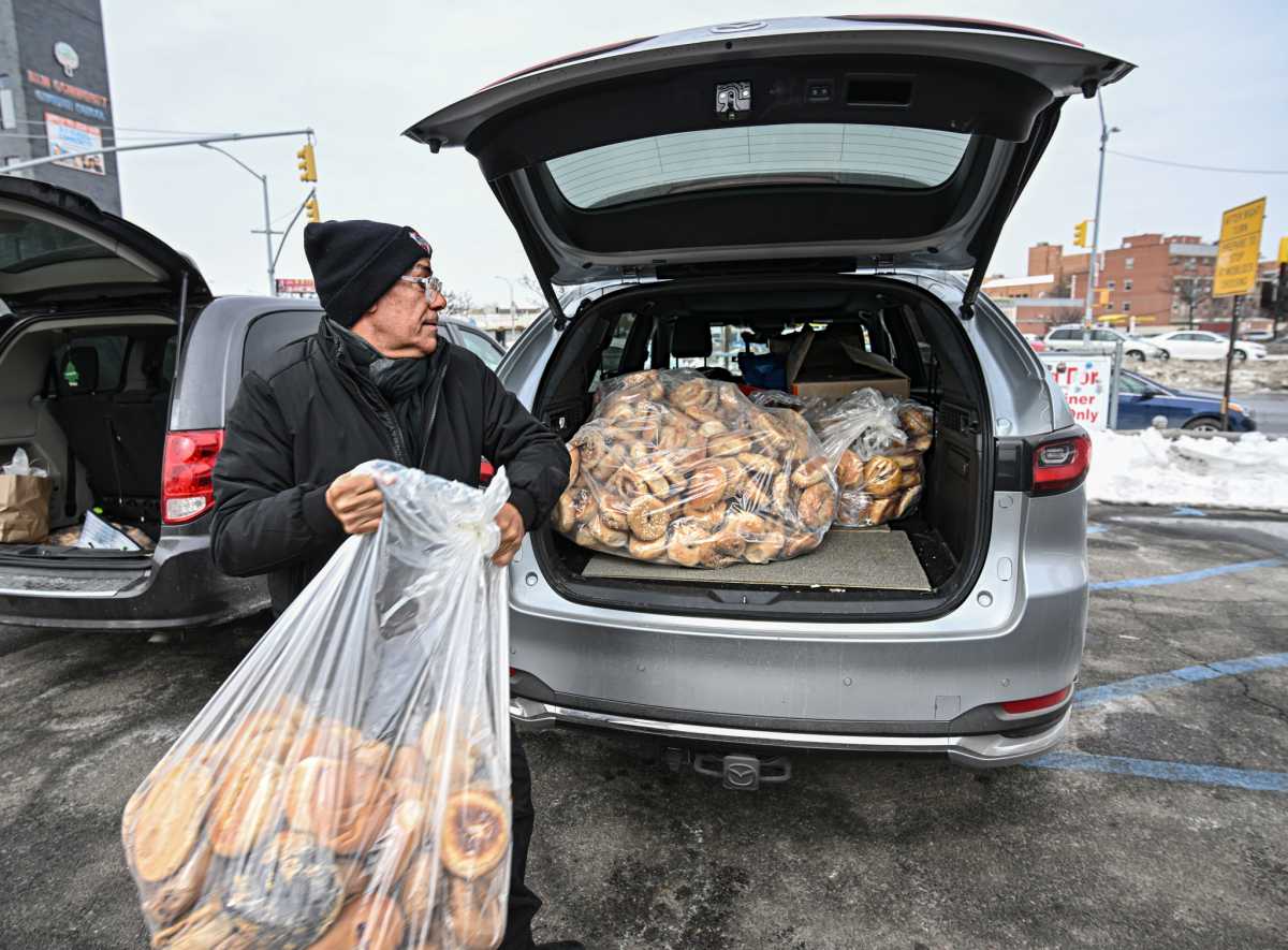 Arias made several trips throughout Queens, some to tout bags of bread, others to supermarkets, where he purchased food items to give away, funded in part by donations from parishioners and community members through the church’s donation site. He could be seen rushing with a cart surrounded by slush and frozen snow through the streets as he raced to gather a bounty for those in need. This was all in addition to a truck dropping off crates of food.