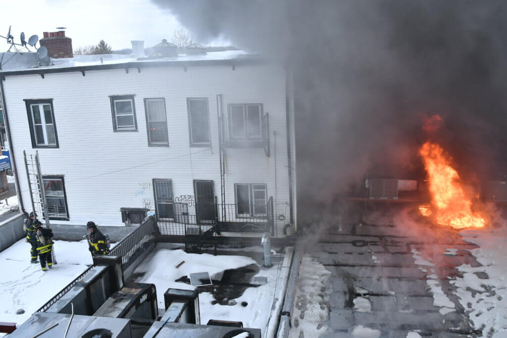 Using three hose lines from tower ladders, among other techniques, the blaze was brought under control at about 9:54 a.m. Sunday.
