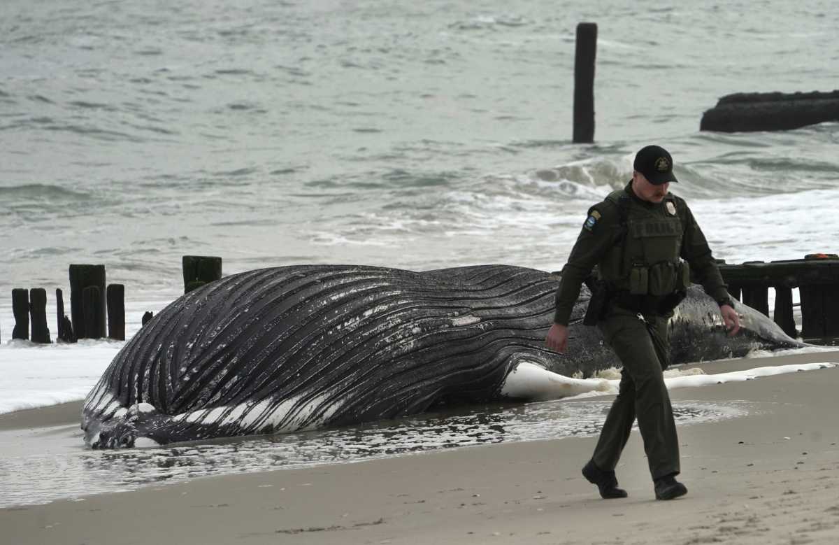 New York State Environmental Conservation police officer watches over a 35-foot humpback whale that is beached at Riis Park, March 31, 2020 in Queens, N.Y. Unknown at this time what caused the mammal to die. (Photo by Debbie Egan-Chin)