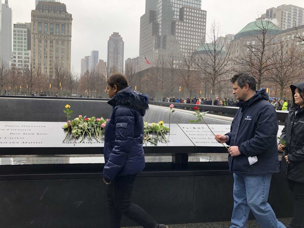 Police pipe bands joined family and friends of John DiGiovanni, Robert Kirkpatrick, Stephen Knapp, William Macko, Wilfredo Mercado and Monica Rodriguez Smith in marching to the 1993 memorial section of the north reflecting pool at the World Trade Center, commemorating the exact minute when that parking garage truck bomb took their lives at 12:18 p.m. those years ago.