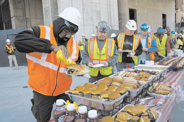 Thanksgiving at the W.T.C. construction site The Friday before Thanksgiving 2010, approximately 500 World Trade Center construction workers scarfed down turkey subs, angus hamburgers and hot dogs supplied by Big Daddies caterers. The workers took a well-deserved break to enjoy a pre-Thanksgiving dinner arranged by developer Larry Silverstein on the ground floor of 4 W.T.C. Interspersed throughout the male-dominated crowd were actual fathers, sons and cousins who all partake in the family construction business. The families felt proud to be a part of such a momentous project. “I had goose bumps, being on a site like this,” said Antonio Rodrigues Sr., sitting next to his nephew, Antonio Rodrigues, Jr. “There’s an amazing amount of people around every day… so you know you’re part of something big.”