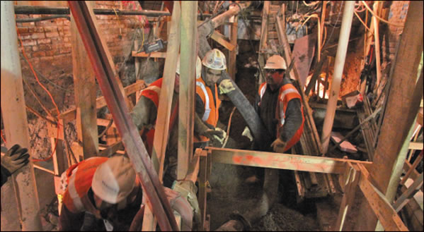 The building’s brick supports originally went down only 20 feet below street level, and the building started sinking as the M.T.A. worked on the adjacent Fulton Transit Center. M.T.A. crews are digging down another 35 feet to underpin the building, a painstaking process that should be complete in August.
