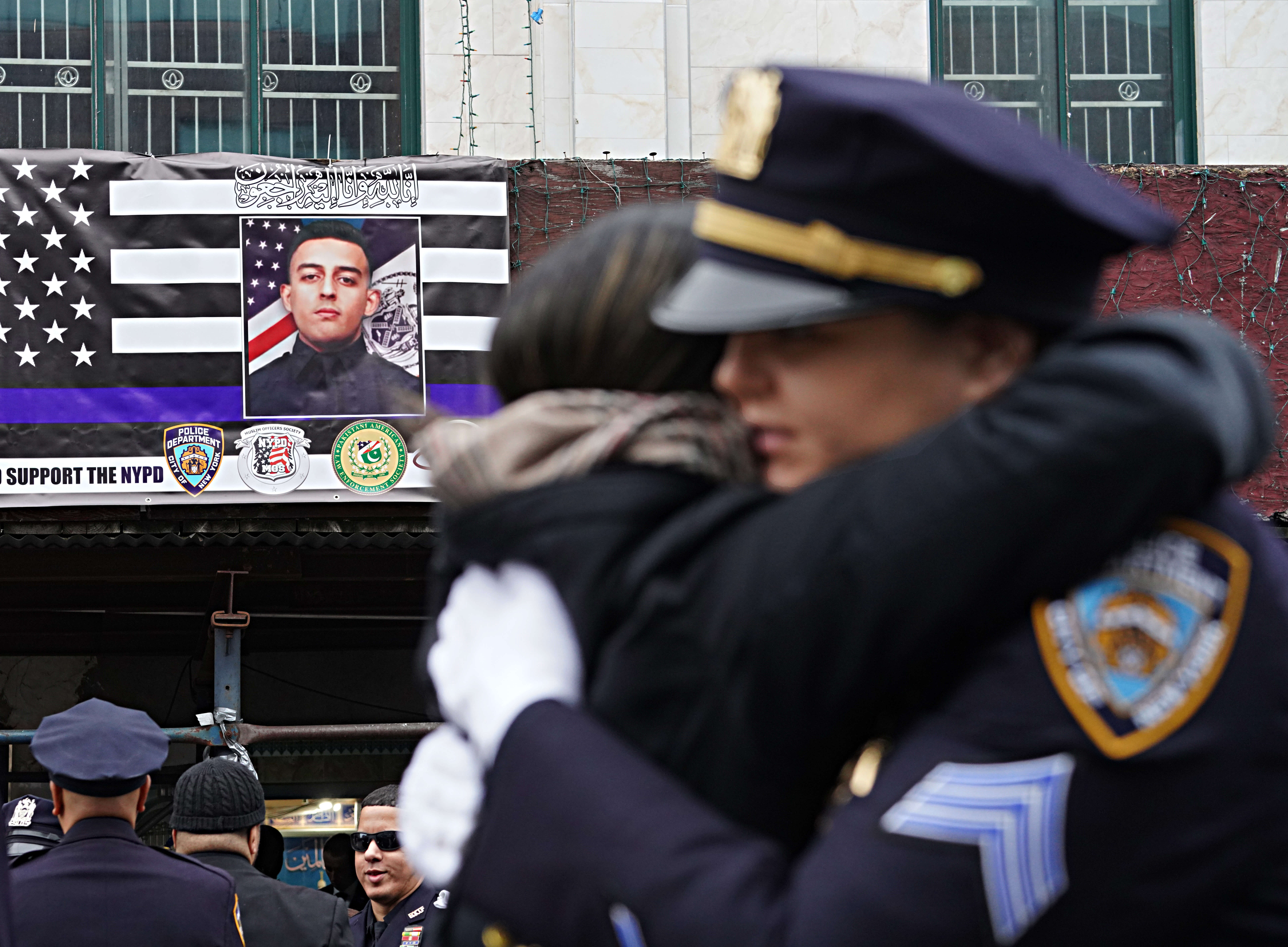 Images of the 26-year-old officer gently swayed in the breeze outside of the Al Rayaan Muslim Funeral Services as hundreds of NYPD officers lined the streets along Coney Island Avenue in Midwood to pay their respects. Family members arrived just after 9 a.m. in tears when they embraced in a burst of unfiltered emotion. Anguished wails could be heard emanating from the funeral home after Fayaz’s mother entered — a grim reminder of the power of a mother’s love.