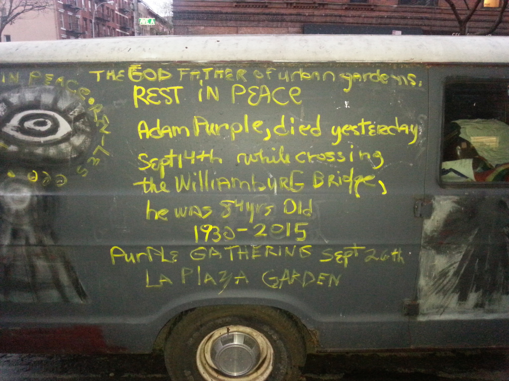 Soon after, he re-emerged in New York City on the Lower East Side, where he reinvented himself as the mysterious yet charismatic hippie figure Adam Purple. Dressed in purple tie-dye and with a succession of two wives named Eve, he created his sprawling Garden of Eden on five lots, which — fertilized by horse manure he collected in Central Park — flourished until 1986, when the city bulldozed it to create affordable housing. In 1999, the city evicted him from the abandoned building on Forsyth St. he had been living in.