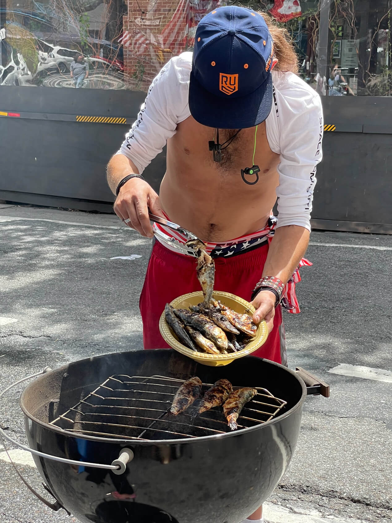 Paolo gets a sprinkler cap from FDNY and concocts a creative street installation with water action, his surfboard and a faux duck. Passersby walk through the good-humored goofiness of this unique holiday observance and are invited to join. Throughout the day the menu includes sardines, sausages, hot dogs, hamburgers, and chicken.