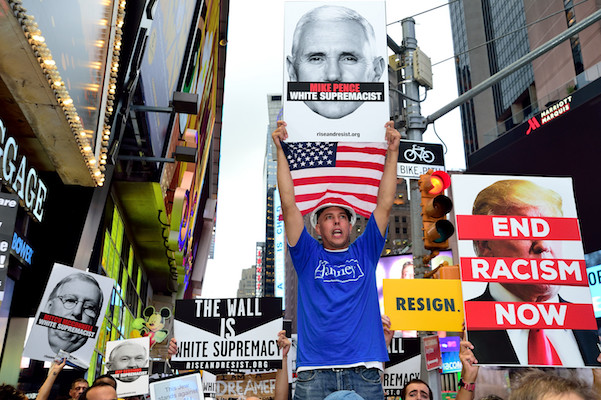 The protest’s theme was opposition to white supremacy, an issue that Trump elevated to a raging national debate with his “many sides” reaction in assigning responsibility for last month’s racist and neo-Nazi marches in Charlottesville, Virginia, that led to the death of Heather Heyer, a counter-protester killed when an Ohio man with a history of pro-Nazi sympathies rammed his car into a crowd gathered to denounce the hate messages.